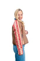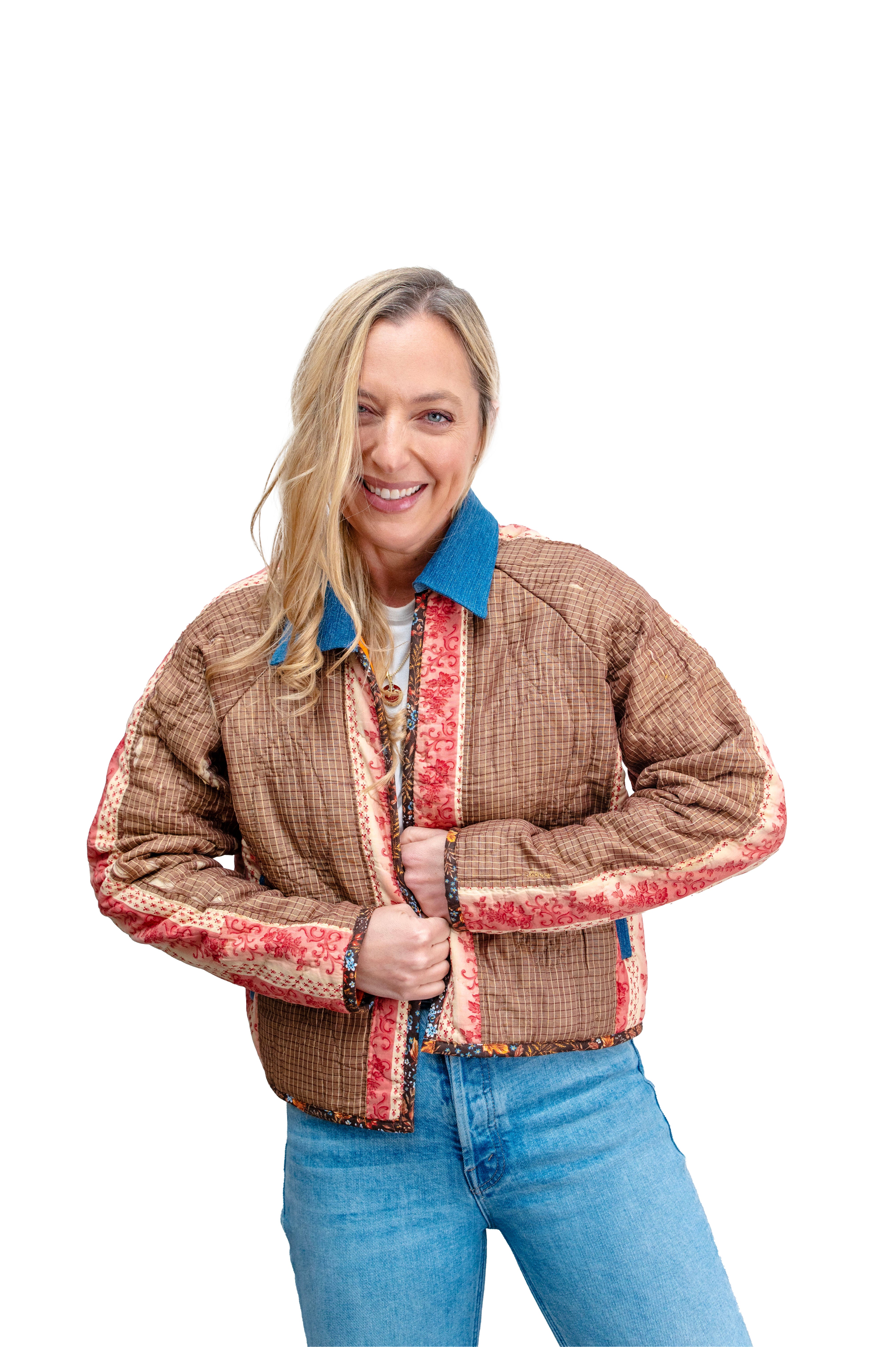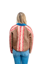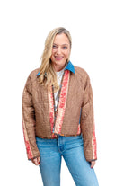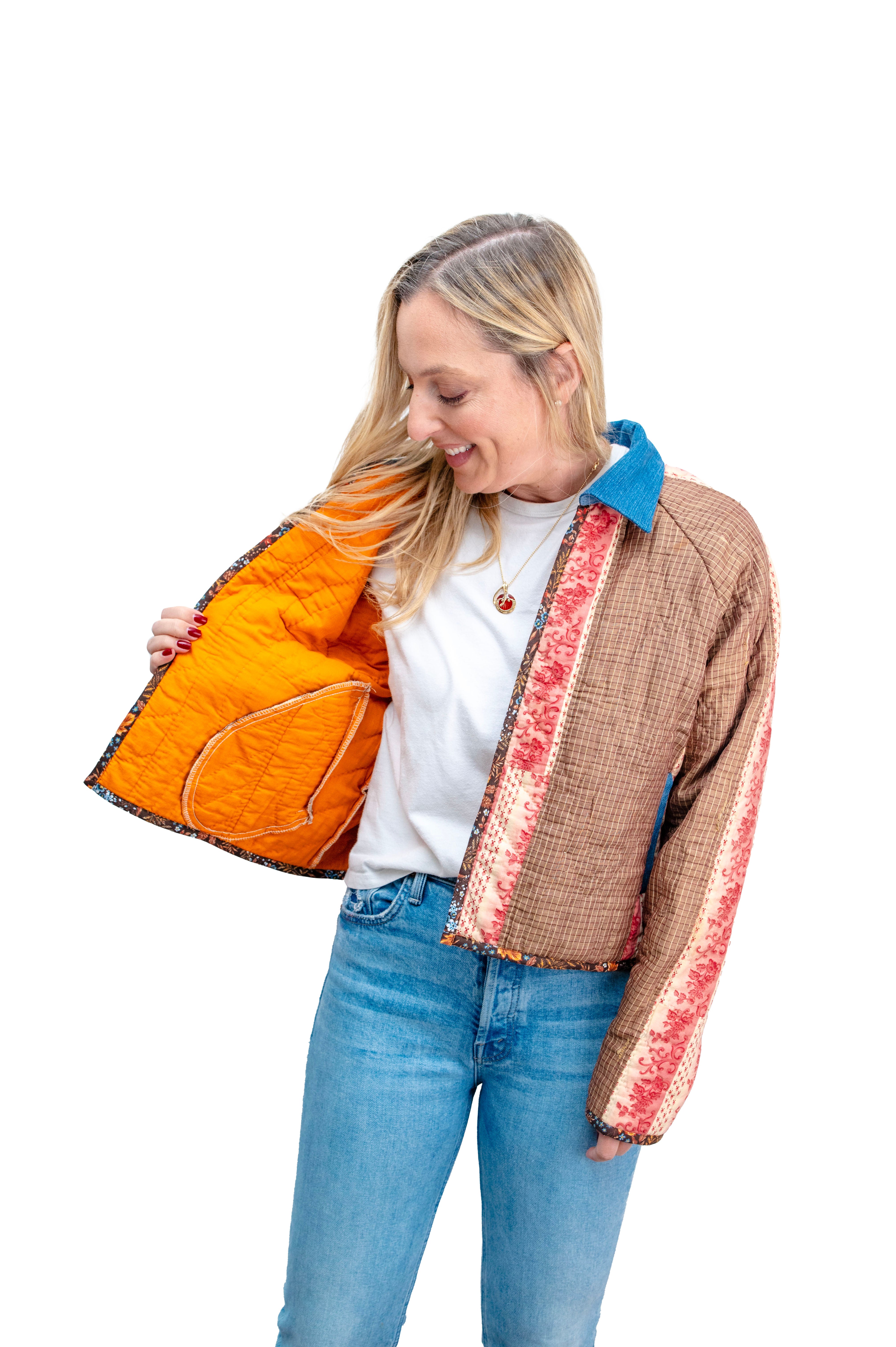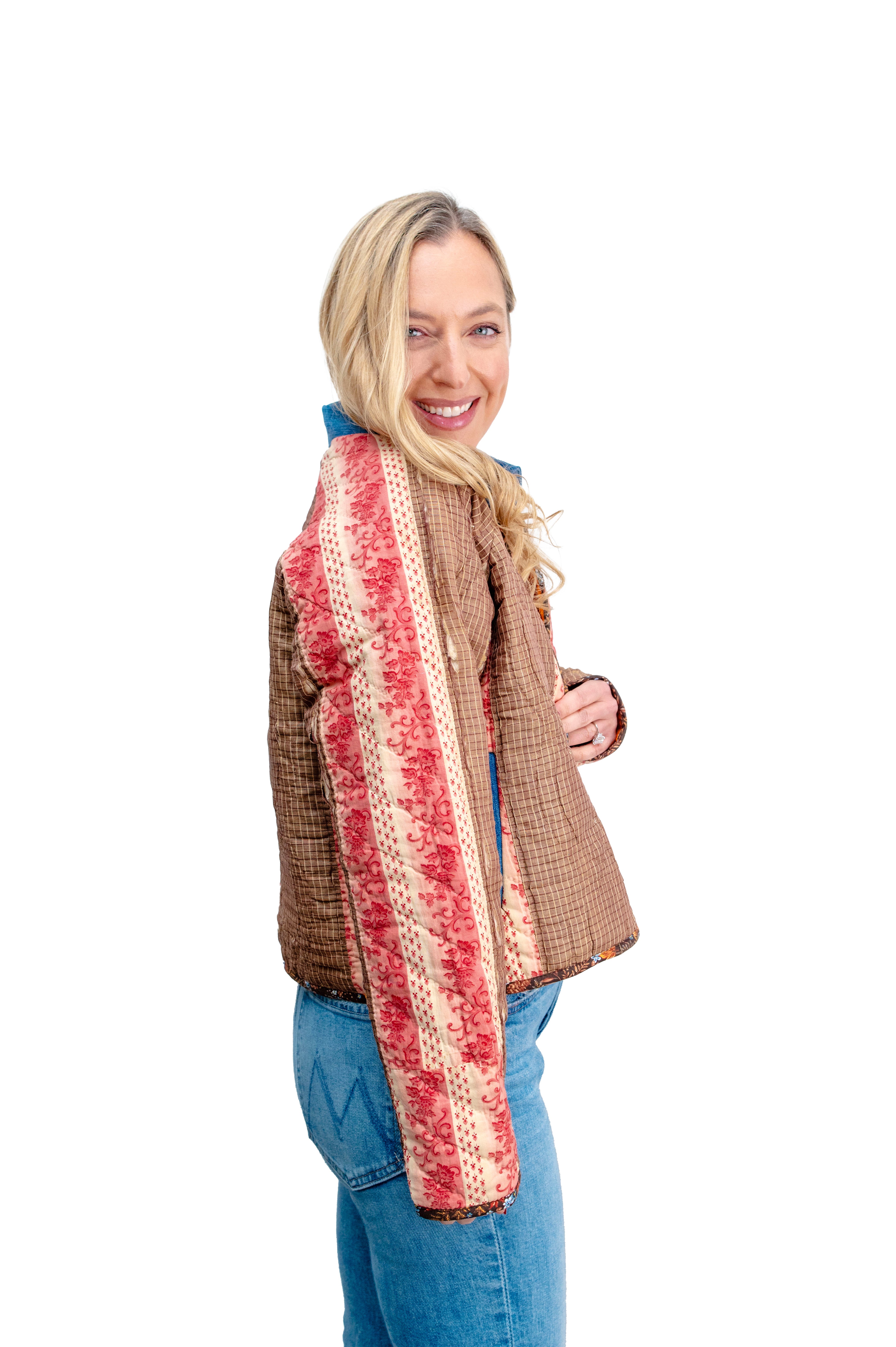 Hidden pockets, Denim collar, minor tearing/splitting of fabric in the brown fabrics due to age